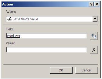 - On the second action we need to set the Category parameter for the “GetProducts” dataconnection, which is a secondary datasource. Select “Set a field’s value” from the action’s dropdown. In the Field section select Category parameter