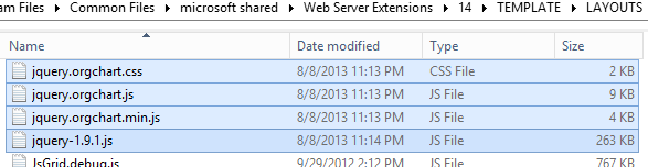 2. Download and place Jquery & jQuery OrgChart plug-in files into the hive’s _layouts folder(see image below).Note : When we are going through a solution deployment approach we need to place these files inside SP Project to package it to a WSP file. Here we are directly copying files to _layouts folder just for the sake of demo. If needed you can place the jQuery Balloon file too.