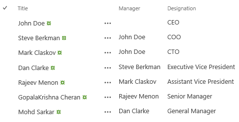 1. Create a custom SharePoint list having columns like Title, Manager, Designation .Enter some logical details as mentioned below.